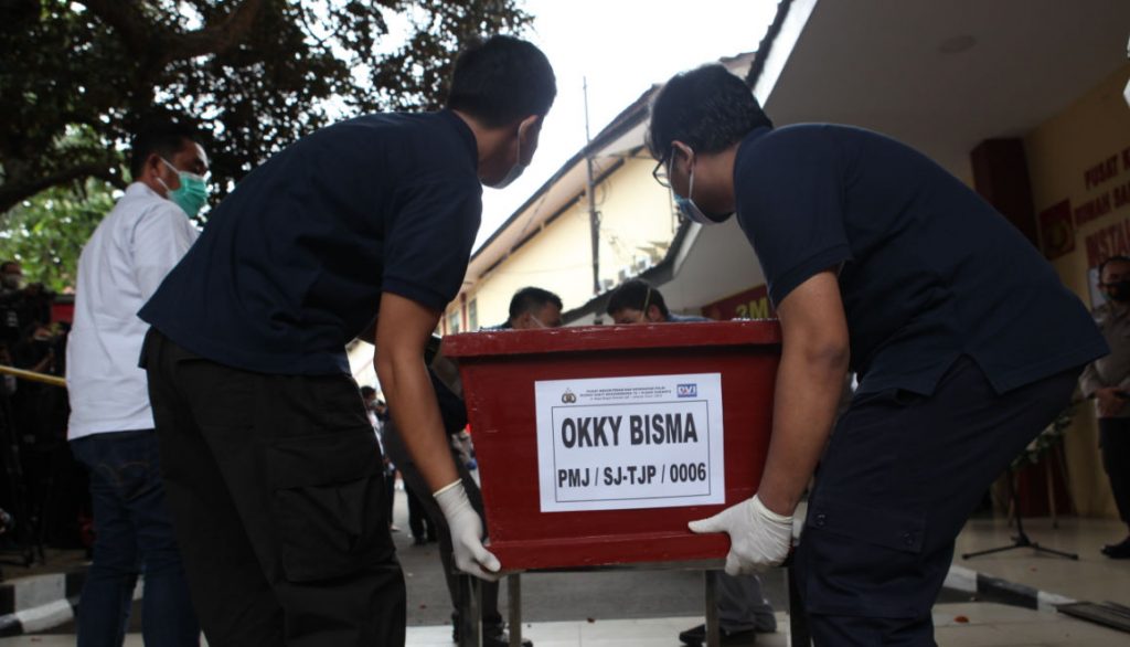 Serah terima jenazah Okky Bisma dilakukan di depan ruang forensik RS Polri, Kramat Jati, Jakarta Timur. Enam anggota keluarga Okky Bisma termasuk istri korban, Aldha Refa dan ayahnya, yakni Supeno Hendi Kiswanto datang didampingi oleh petugas kepolisian.