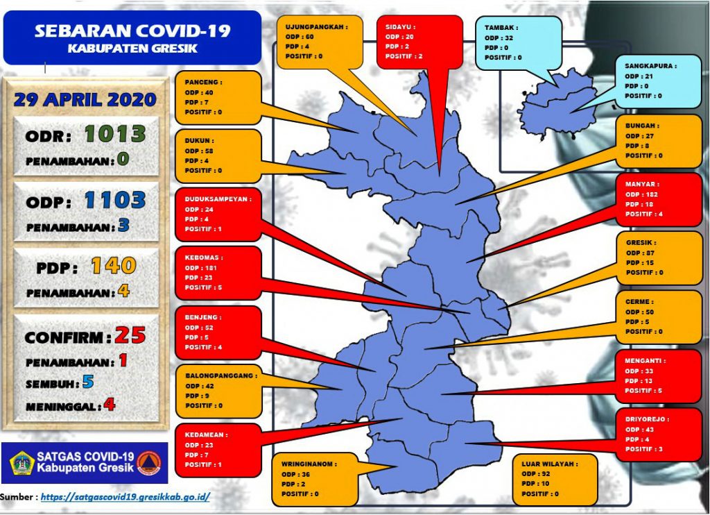 “Selain tambahan satu positif, hari ini juga ada penambahan 4 orang pasien dalam pengawasan (PDP), sehingga menjadi 140, dari jumlah sebelumnya 130 orang. Dari jumlah itu, 91 dalam pengawasan, 44 orang selesai pengawasan, dan 5 orang meninggal,” ungkap Ghozali yang juga Kadinkes Gresik ini, Rabu (29/4).