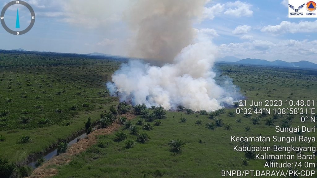 Kepulan asap putih dari kebakaran hutan di kawasan perkebunan kelapa sawit di Sungai Duri, Bengkayang, Selasa (21/6/2023). (foto Humas BPBD Kalbar).