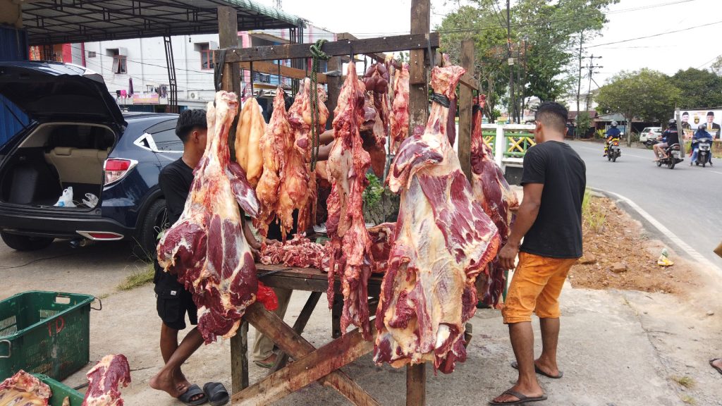 Pontianak, Kalimantan Barat, reportasenews.com – Mendekati lebaran, harga daging sapi segar dan ayam potong di sejumlah pasar di kota Pontianak, kompak naik, Kamis (20/4/2023).
