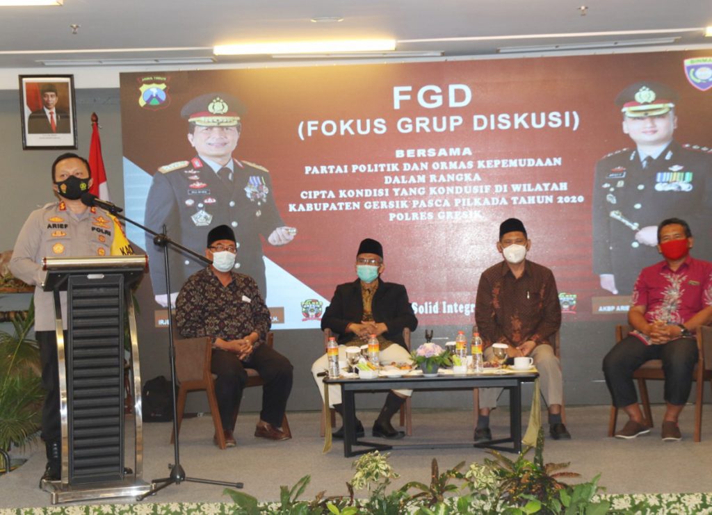 Gresik, Reportasenews.com – Guna menguatkan kebhinekaan dalam rangka menangkal Radikalisme dan Intoleransi dalam kehidupan berbangsa dan bernegara, Kapolres Gresik menggelar giat Fokus Grup Diskusi (FGD) bersama Parpol dan Ormas Kepemudaan serta elemen masyarakat lainnya, Selasa (29/12/2020).