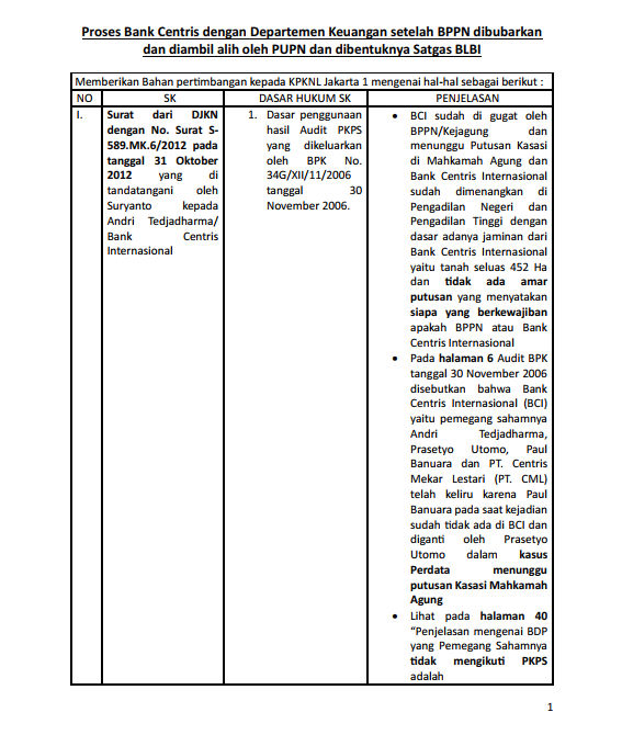Berikut kronologis perkara bank Centris dengan Kementrian Keuangan setelah BPPN dibubarkan dan diambil alih oleh PUPN dan dibentuknya Satgas BLBI :