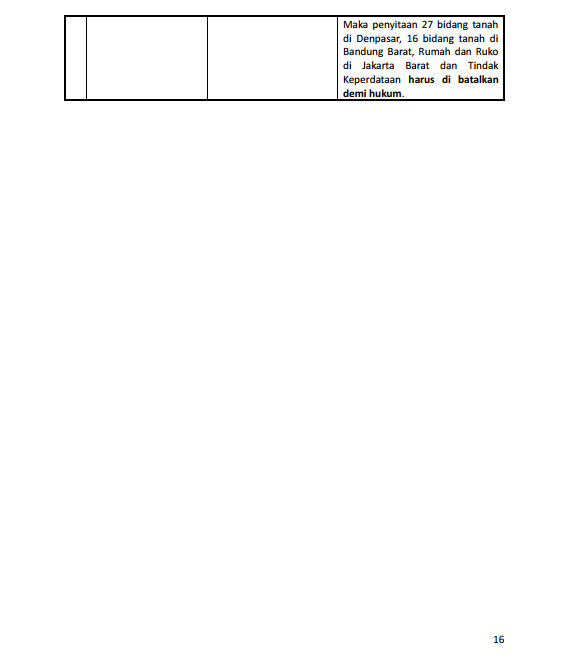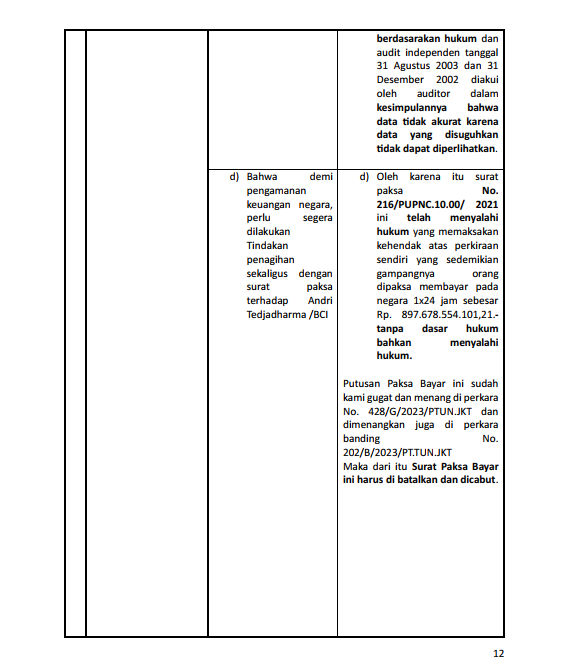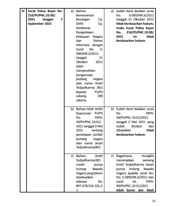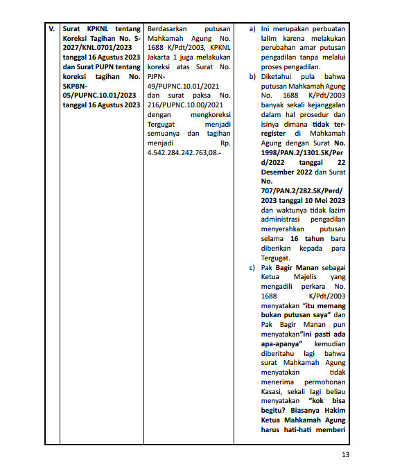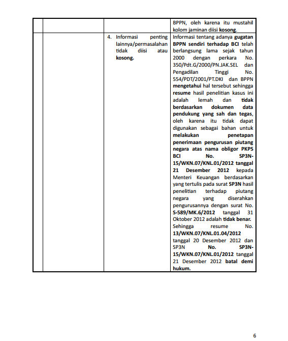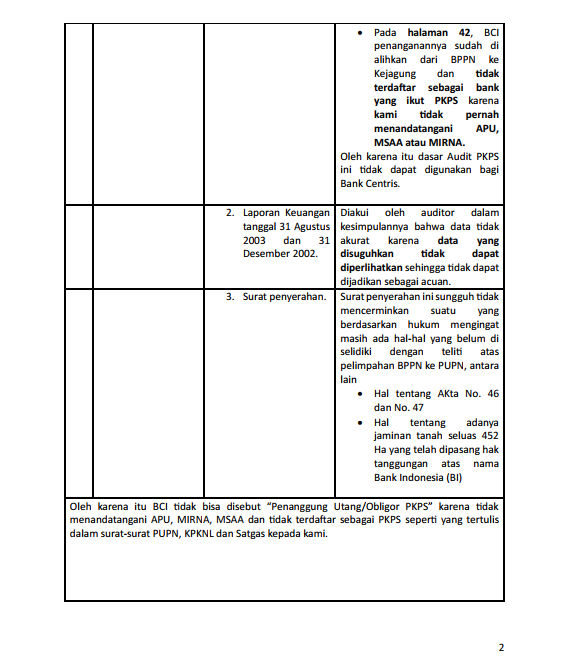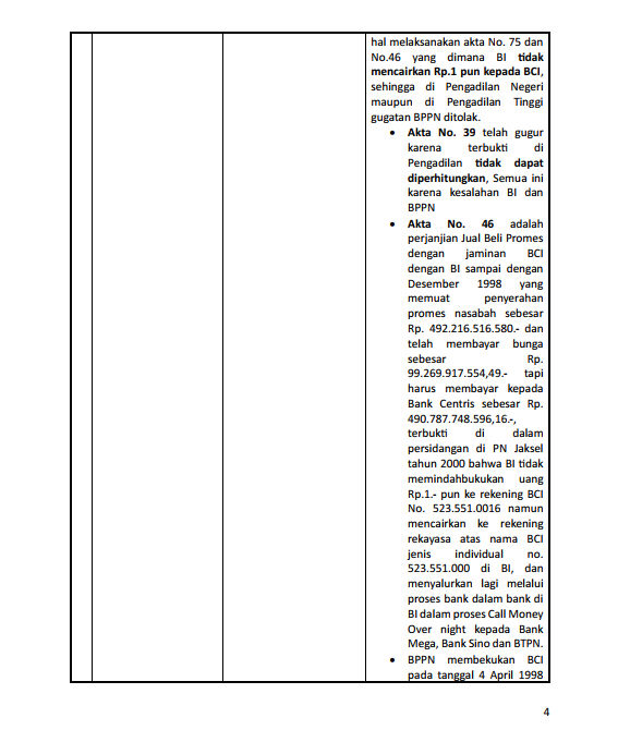 Salah satu dasar hukum surat DJKN tersebut adalah surat pelimpahan dari BPPN ke PUPN yang tidak sempurna karena beberapa informasi peting tidak disampaikan diantaranya terkait adanya akta 46 dan 47 tentang adanya jaminan tanah seluas 452 hektar yang telah dipasang hak tanggungan atas nama Bank Indonesia.