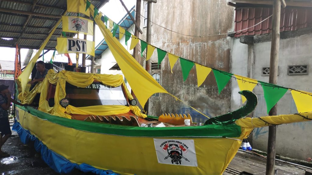 Salahsatu kendaraan hias berwujud Kapal Lancang Kuning akan memeriahkan pawai Akbar kendaraan hias malam ini dilanjutkan pawai obor dalam memeriahkan menyambut Ramadhan 1444 H. Kegiatan ini dilangsungkan dua hari mulai malam ini hingga malam besok. (foto Humas Kompak Pontianak).