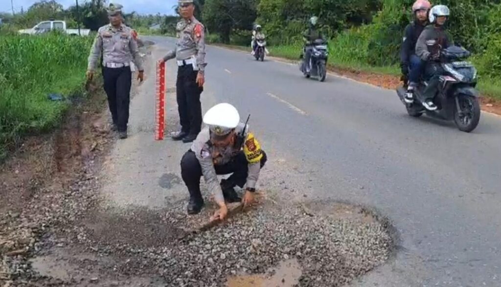 Kubu Raya, reportasenews.com – Kondisi jalan berlubang di ruas Jalan Trans Kalimantan, tepatnya di KM 36 hingga KM 41 Desa Teluk Bakung, Kubu Raya, Kalimantan Barat, memerlukan perhatian serius. Kasat Lantas Polres Kubu Raya, AKP Supriyanto, S.H., M.A.P., melaui Kasubsi Penmas AIPTU Ade mengungkapkan bahwa lubang dengan diameter 50 cm dan kedalaman 20 cm ini telah menyebabkan kecelakaan maut.