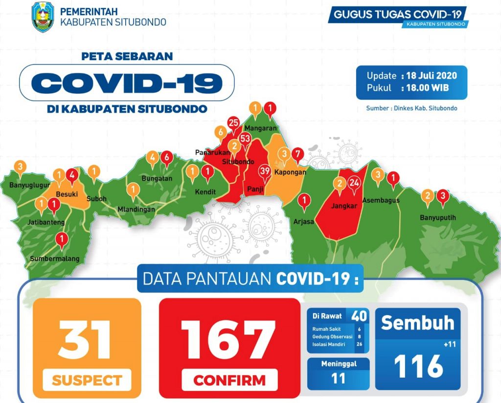 Situbondo,reportasenews.com – Jumlah pasien terkonfirmasi positif virus corona atau Covid-19, yang dinyatakan sembuh bertambah 11 orang, sehingga jumlah total yang dinyatakan sembuh sebanyak 116 orang, dari jumlah total yang terkonfirmasi positif covid-19 sebanyak 167 orang di Kabupaten Situbondo, Sabtu (18/7/2020).
