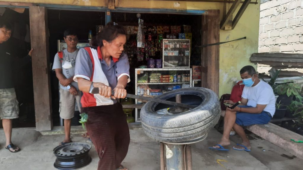 Ibu dari Sheli Mandalahi (7th) dan Ritzven Mandalahi (5th) ini hanya dengan satu tangannya mampu mengangkat ban mobil. Cukup butuh 5 menit baginya untuk melepaskan ban mobil dari velg. Di bawah terik matahari, ia menggelosor di tanah berpasir, memasang dongkrak, kemudian mengganti ban yang bocor.