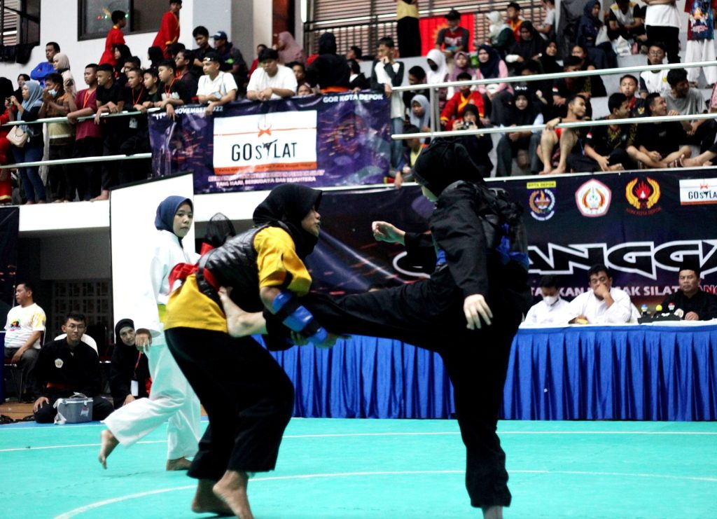 Najmi Fatharani Raih saat bertanding di partai final kejuaraan silat antar pelajar Cimanggis Cup yang berlangsung di GOR Kota Depok.