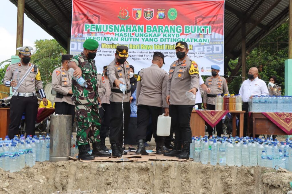 Sebagai informasi, barang bukti yang dimusnahkan didapatkan Polres Ngawi dari para tersangka yang menjual dan mengedarkan minuman beralkohol serta obat keras berbahaya tanpa disertai ijin dari Pemerintah, juga knalpot brong didapat dari razia yang rutin dilaksanakan malam hari dan kegiatan KRYD (Kegiatan Rutin Yang Ditingkatkan).