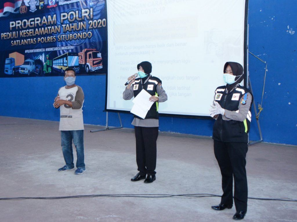 Situbondo,reportasenews.com – Sebanyak 125 sopir angkutan umum, ojek, dan abang becak di Kota Situbondo, mereka mengikuti sosialisasi tentang pola hidup sehat, yakni tentang tata cara cuci tangan, sebagai upaya untuk memutus mata rantai penyebaran virus corona atau covid 19 di Kabupaten Situbondo.