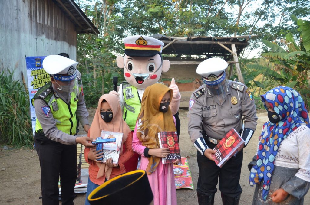 Menariknya, dalam membagikan bantuan peralatan sekolah dan masker, Kasatlantas AKP Indah Citra Fitriani dan Kasat Binmas Iptu Djembadi juga membawa Polisi Sahabat Anak atau Si Bontas. Praktis, kegiatan peduli pendidikan itu, langsung menarik para siswa sekolah di daerah terpencil tersebut.