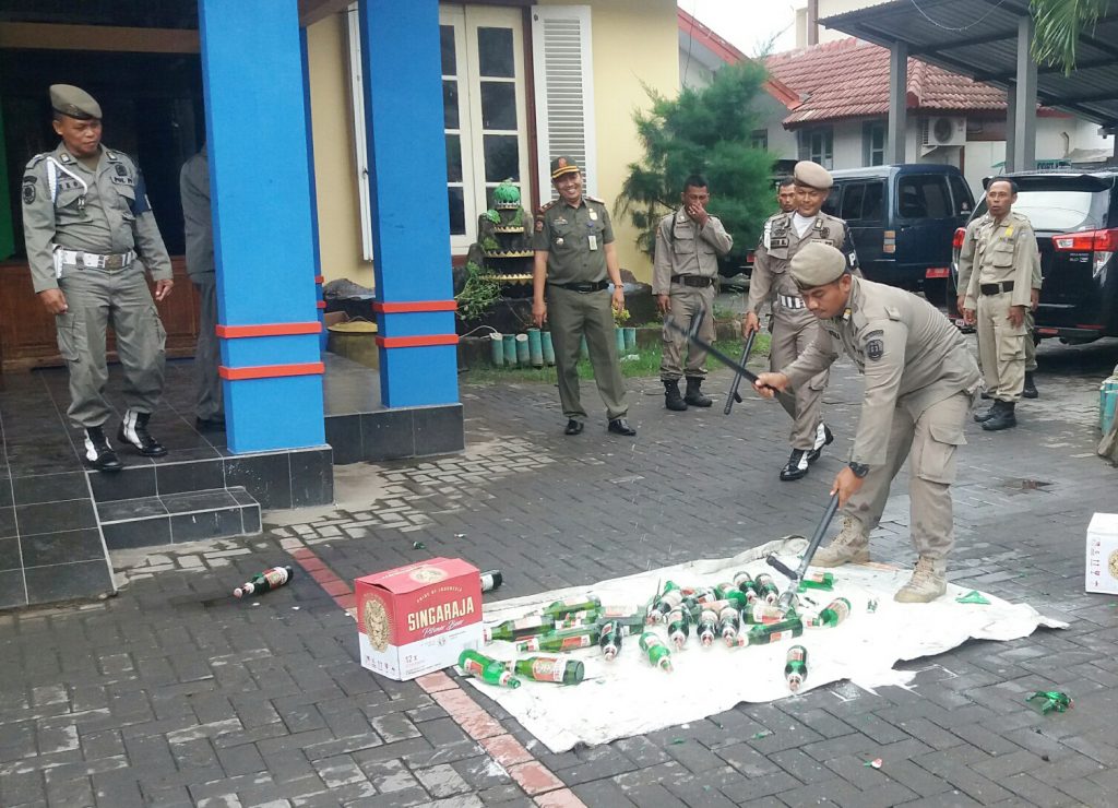 Menariknya, dalam memusnahkan sebanyak 28 botol miras merek Singaraja Bali, petugas Satpol PP Pemkab Situbondo, menggunakan alat pentungan untuk memusnahkan puluhan botol miras tersebut.
