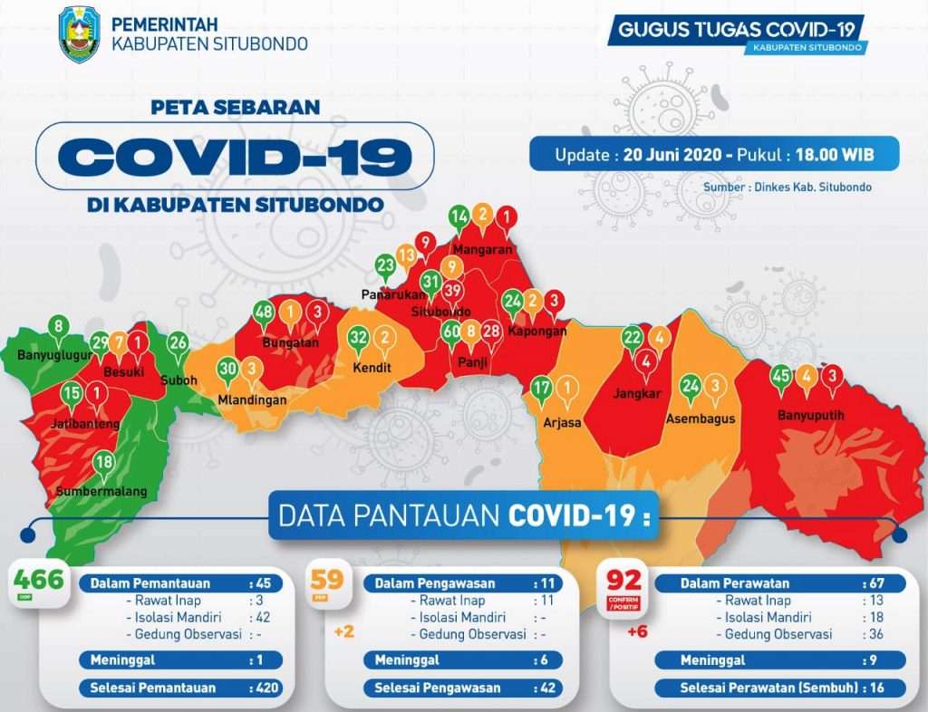 Juru bicara Gugus Tugas Covid-19 Kabupaten Situbondo Dadang Aries Bintoro mengatakan, tambahan 6 kasus positif Covid-19 di Kabupaten Situbondo itu, tersebar pada tiga kecamatan di Kabupaten Situbondo, yakni Kecamatan Jangkar, Kecamatan Kota, dan Kecamatan Kota.”Dengan rincian, masing-masing kecamatan bertambah 2 kasus,”ujar Dadang Aries Bintoro, Sabtu (20/6/2020).