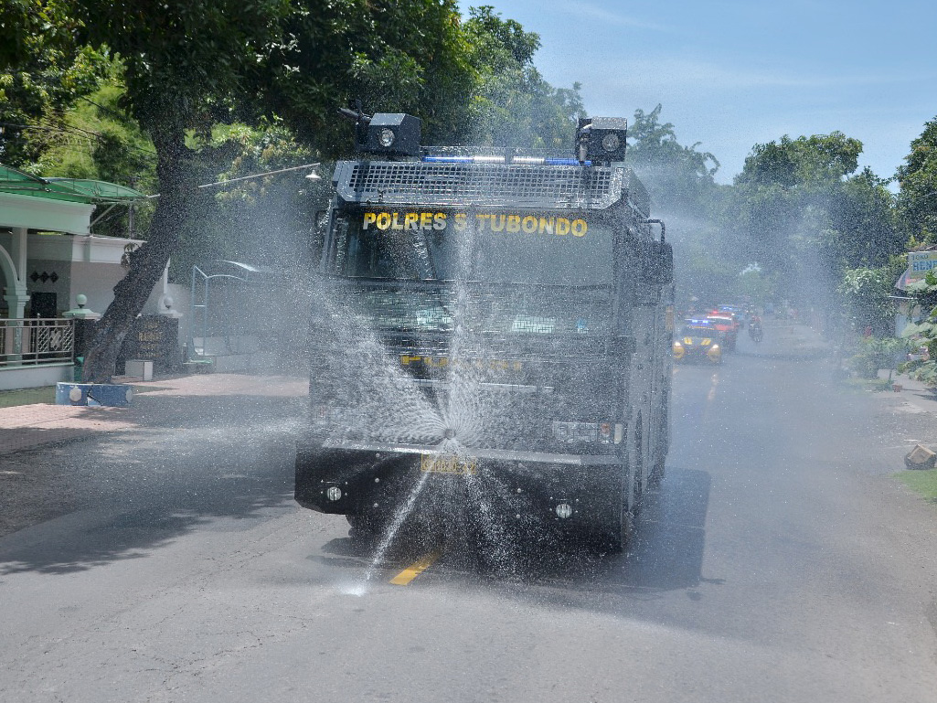 Polda Kalbar Kerahkan Water Canon Semprotkan Cairan Disinfektan di Jalan Protokol Kota Pontianak