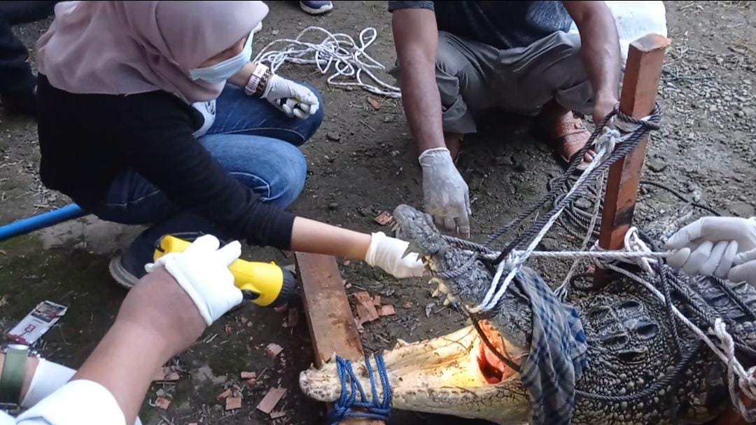Tim BKSDA Wilayah II Kabupaten Langkat Keluarkan Mata Kail dari Mulut Buaya yang Ditangkap Warga