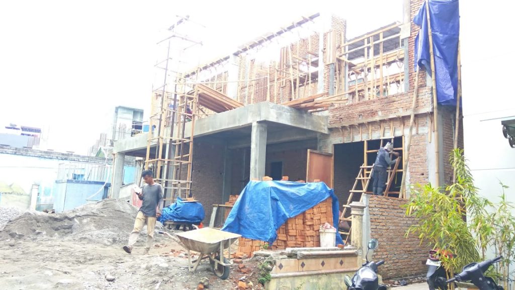 Di lokasi perumahan, para pekerja bangunan masih melakukan kegiatan pekerjaan, walau belum mengantongi IMB.