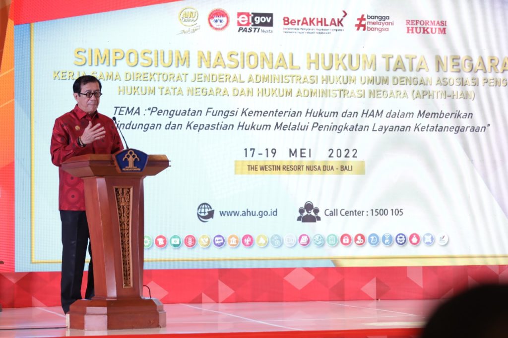 “Layanan-layanan Ditjen AHU di bidang ketatanegaraan tersebut, tentunya belum benar-benar dikenal atau dipahami masyarakat secara luas. Sehingga dalam kesempatan yang berbahagia ini, saya berharap APHTN-HAN juga mampu memahami adanya layanan-layanan tersebut dan mampu terlibat dalam proses edukasi kepada masyarakat,” kata Yasonna, saat memberikan sambutan pada acara Simposium Nasional Hukum tata Negara bertemakan Penguatan Fungsi Kementerian Hukum dan HAM dalam Memberikan Perlindungan dan Kepastian Hukum Melalui Peningkatan Layanan Ketatanegaraan yang diadakan atas kerjasama Ditjen AHU bersama Asosiasi Pengajar Hukum Tata Negara dan Hukum Administrasi Negara (APHTN-HAN), di Bali, Rabu (18/05).
